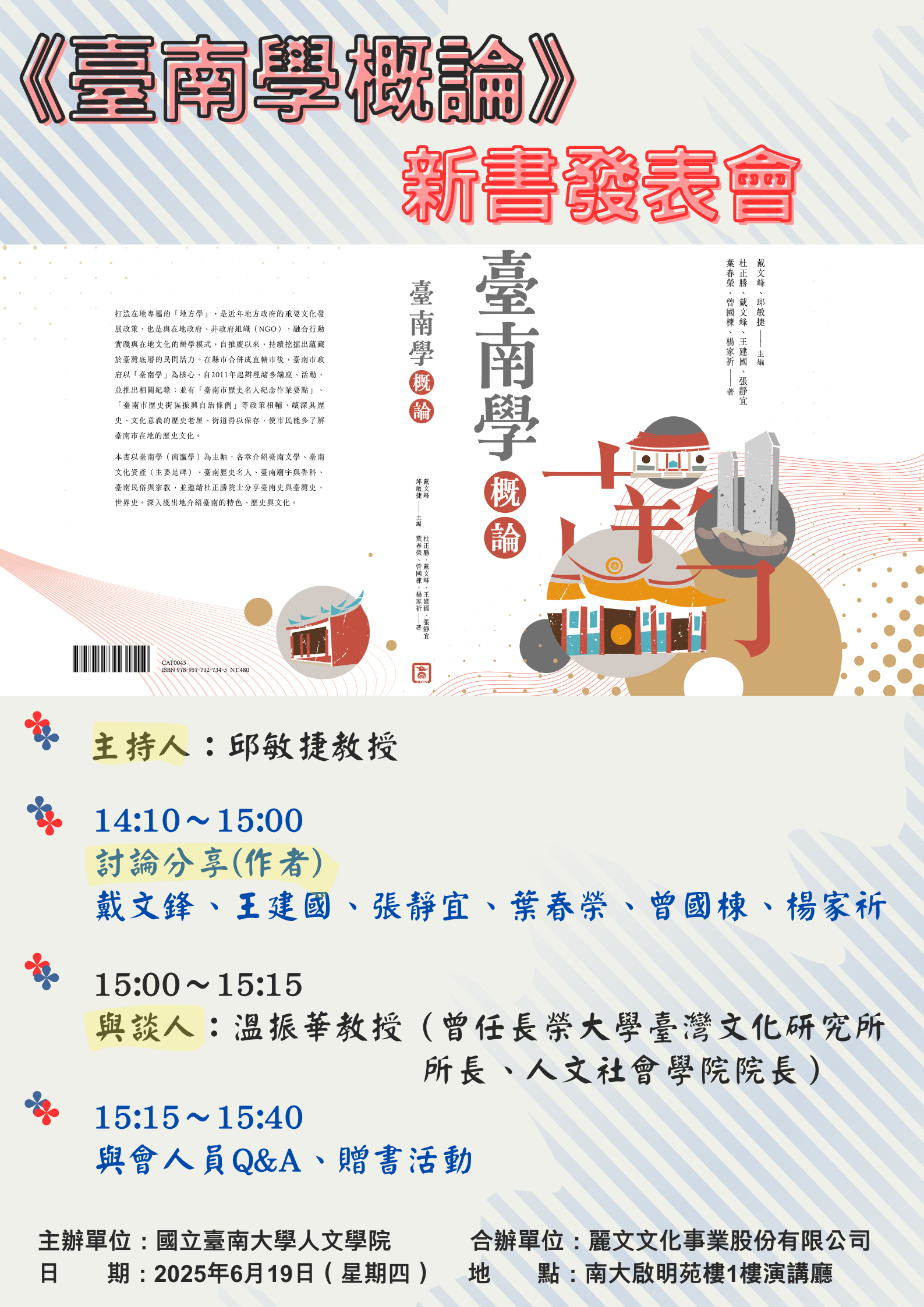【國立臺南大學 函】本校人文學院訂於114年6月19日(星期四)舉辦 「2025《臺南學概論》新書發表會」
