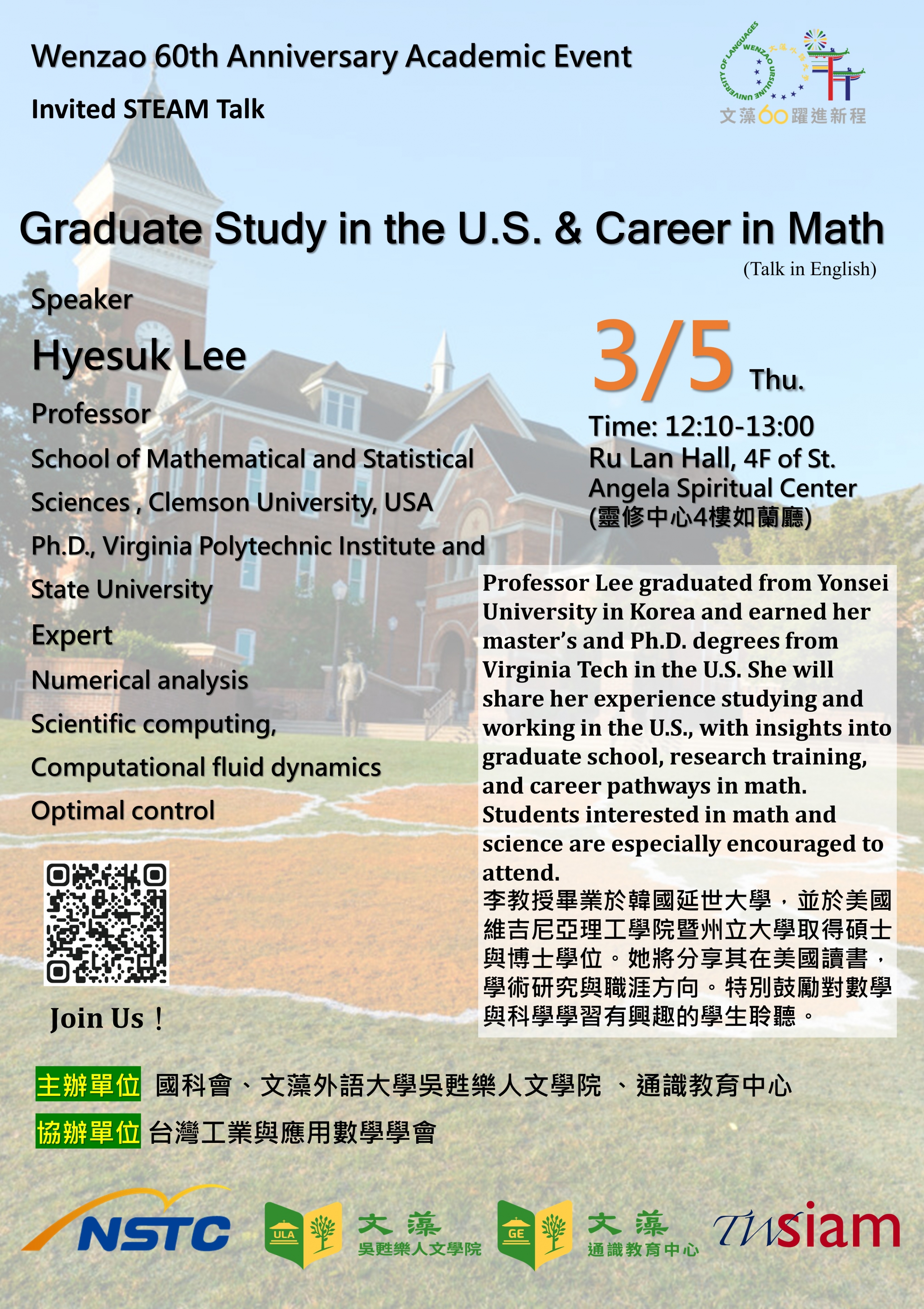 李教授畢業於韓國延世大學,並於美國維吉尼亞理工學院暨州立大學取得碩士與博士學位。她將分享其在美國讀書,學術研究與職涯方向。特別鼓勵對數學與科學學習有興趣的學生聆聽。
